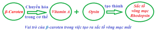 Khi vào cơ thể mỗi phân tử β-Caroten sẽ được chuyển hóa thành 2 phân tử Vitamin A, vì vậy còn được gọi là tiền Vitamin A.. Nó cần thiết cho sự phát triển hoàn thiện và duy trì chức năng của thị giác.